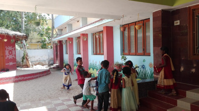 Da es viel zu streichen gab und ich etwas Zeitdruck hatte, halfen mir später drei andere Freiwillige und ein paar Jungs die bei Sandhyamma wohnen und Collegeferien hatten. Nach drei Tagen Streichen waren wir endlich mit der Grundierung fertig. Jetzt fehlte nur noch die Malerei darauf. Das Außengelände sollte mit Blumen verziert werden, ein Klassenraum sollte mit dem englischen Bilderalphabet verschönert werden und in einem weiteren Raum sollten Matheformeln an die Wand. Wer mitgezählt hat weiß, dass mir nur noch zwei Schultage blieben. Glücklicherweise halfen die anderen Freiwilligen mit und zu sechst hatten wir bis Samstag Abend schon sehr viel geschafft. Trotzdem waren wir immer noch nicht fertig, weswegen wir beschlossen auch am Sonntag in die Schule zu gehen und alles fertig zustellen. Trotz einer Woche ohne Pause waren wir auch am Sonntag Abend immer noch nicht fertig. Da noch ein paar Kleinigkeiten fehlten beschlossen wir am Montag schon um 6:30 Uhr morgens in die Schule zu fahren um diesmal wirklich alles vor Schulbeginn zu beenden. Und tatsächlich wurden wir gerade fertig, als der Schulbus vorfuhr. Ich hatte die Kinder 2,5 Wochen nicht gesehen und echt vermisst, weswegen es um so schöner war ihre strahlenden Augen zu sehen als sie den neuen Look der Schule begutachteten.